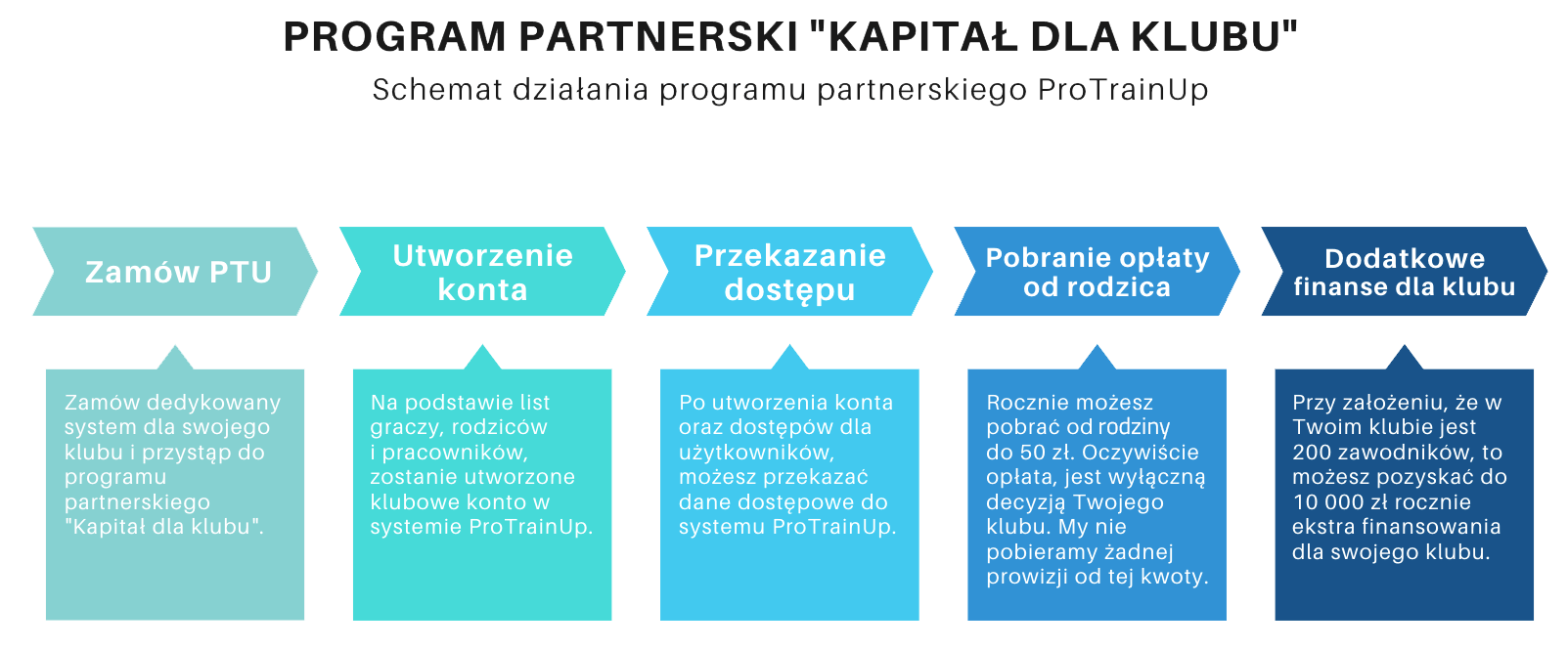 Głównym założeniem tego programu jest pełna dobrowolność klubu w naliczaniu rodzicowi opłaty za dostęp do systemu ProTrainUp. W przypadku decyzji o pobraniu od rodzica opłaty, zgodnie z zapisami umowy między ProTrainUp a Klubem, klub może zatrzymać całość pobranej od rodzica kwoty płaconej przez klub lub rodziców za dostęp do systemu ProTrainUp. Podpisując umowę z ProTrainUp, klub staje się dysponentem loginów i haseł rodziców i zawodników. Roczny koszt dostępu dla zawodnika i dwojga rodziców, to w zależności od podjętej przez klub decyzji od 0zł do max 50zł. Rozliczenie tej kwoty może oprzeć się o jednorazową płatność lub doliczając część kwoty do miesięcznej składki. Klub oczywiście może odstąpić w każdym momencie od pobierania opłaty od rodziców za dostęp do systemu.